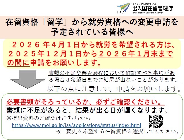出入国在留官庁HP → 在留資格「留学」から就労資格への変更申請を予定されている皆様へ | 出入国在留管理庁