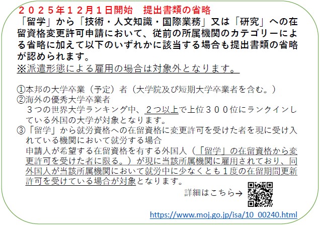 さらに2025年12月1日から、従来の所属機関のカテゴリーによる提出書類の省略に加え、在留資格「留学」から「技術・人文知識・国際業務」又は「研究」への在留資格変更許可申請について、以下のいずれかに該当する場合には提出書類の省略が可能です(省略を認める書類についてはカテゴリー2と同様です。)。